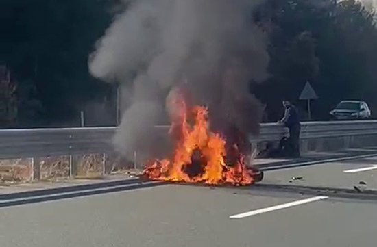 Yangın sırasında büyük panik yaşanırken, motosikletin sürücüsü kazayı hafif yaralı olarak atlattı. Alev alev yanan motosiklet, yolda duran diğer sürücüler tarafından cep telefonu kamerasıyla görüntülendi.