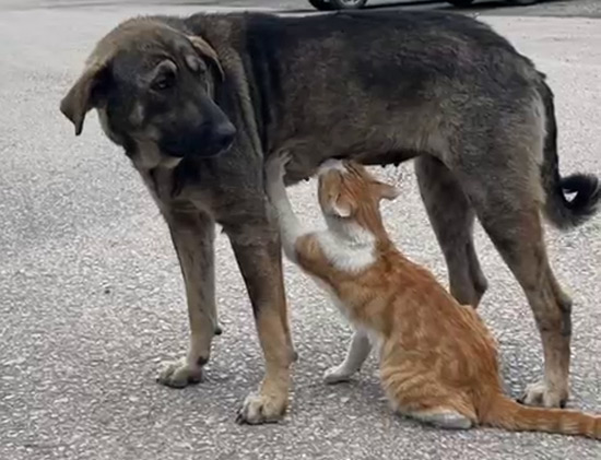 Olay, Antepoğlu Sanayi Sitesi’nde meydana geldi. Esnafın beslediği dişi köpek, bir süredir çevrede dolaşan yavru bir kediyi yanına alarak emzirmeye başladı. O anlara tanık olan esnaflar cep telefonlarının kameralarıyla kayda girdi.