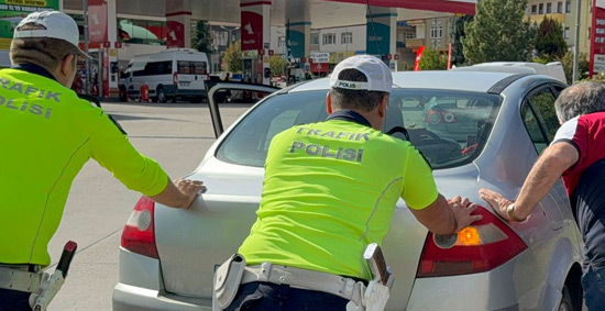 Şehit Ateşe Reşat Moralı Bulvarı’nda seyir halindeki bir sürücünün otomobili Sanayi kavşağı mevkisinde arıza yaptı. Bu sırada bölgeden geçen İl Emniyet Müdürlüğü Trafik Şube Müdürlüğünde görevli polis memurlarından biri otomobili iterek sürücüye yardım etmeye çalıştı. Rampaya gelindiğinde polis otosundan inen diğer memurda aracı iterek yol kenarında bulunan akaryakıt istasyonuna götürdü. Otomobil sürücüsü polislere teşekkür etti.