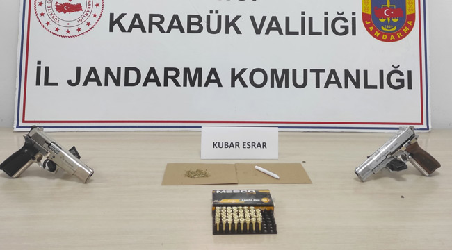 İl Jandarma Komutanlığı ekipleri, uyuşturucuyla mücadele kapsamında çalışma yürüttü. Yapılan operasyonda şüphelinin üzerinde, aracında ve iş yerinde yapılan aramalarda içime hazır 0,76 gram kubar esrar, 0.16 gram kubar esrar ile 2 kurusıkı tabanca ve bu tabancaya ait 39 mermi ele geçirildi. Gözaltına alınan şüpheli işlemlerinin ardından adliyeye sevk edildi.