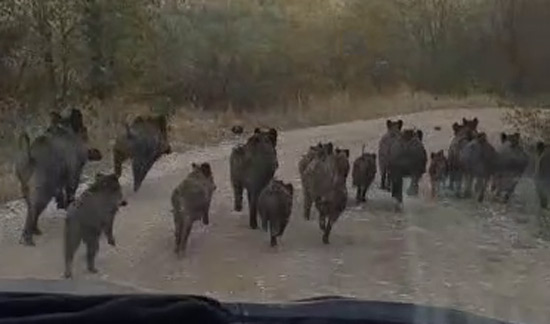 İlçenin 1700 rakımlı Sarı Çiçek Yaylası’nda ilerleyen araçtakiler yaban domuzu sürüsü ile karşılaştı. Sayısı 18’i bulan domuz sürüsü, bir süre yolda koştuktan sonra ormana girdi ve gözden kayboldu. O anlar, araçtakiler tarafından cep telefonu kamerasıyla kaydedildi.
